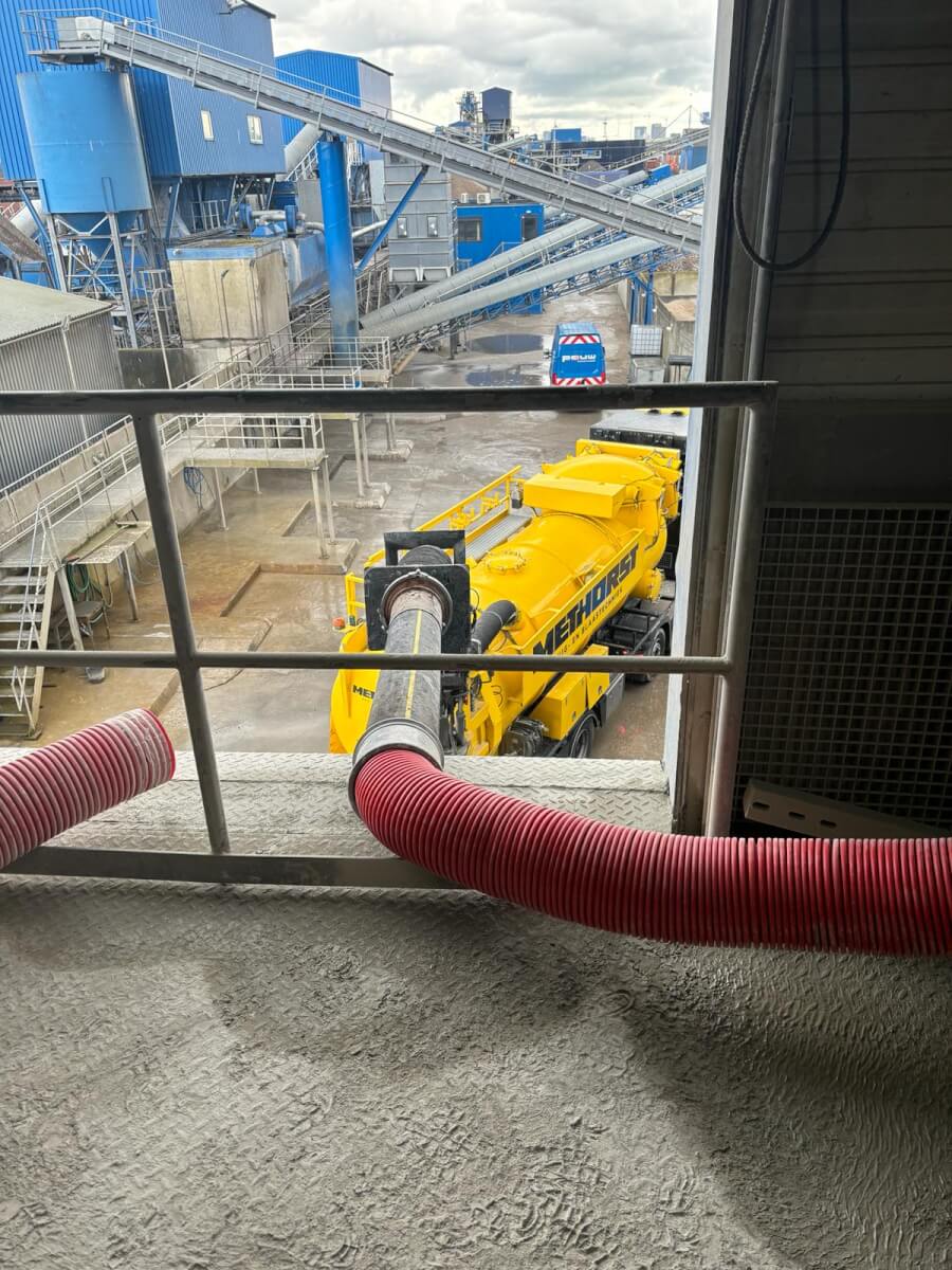 Cement opzuigen naast de silo’s