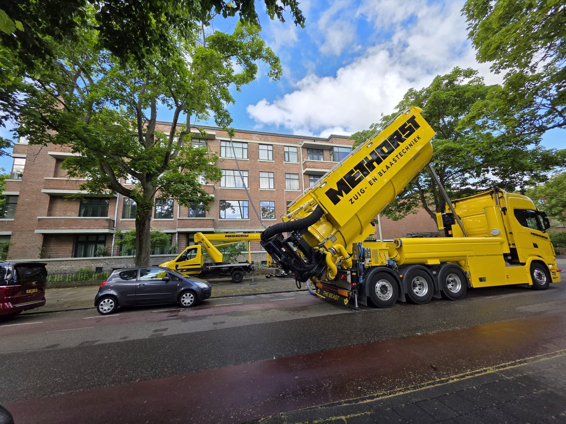 Voor een bedrijfsdak in Den Haag moest een nieuwe ballastlaag van 62 m³ grind (16/32 mm) worden aangebracht. Het grind moest gelijkmatig verdeeld worden over een oppervlakte van 1.030 m² in een laagdikte van 60 mm. De grootste uitdaging zat in de hoogte van het gebouw: 14 meter. Traditionele methoden, zoals het omhoog hijsen van bigbags met een kraan of het gebruik van bakken, waren niet haalbaar door de beperkte toegang tot het dak en de logistieke omstandigheden op locatie. Er was dus een efficiënte oplossing nodig waarmee het grind nauwkeurig, veilig en zonder extra zware hulpmiddelen kon worden aangebracht.