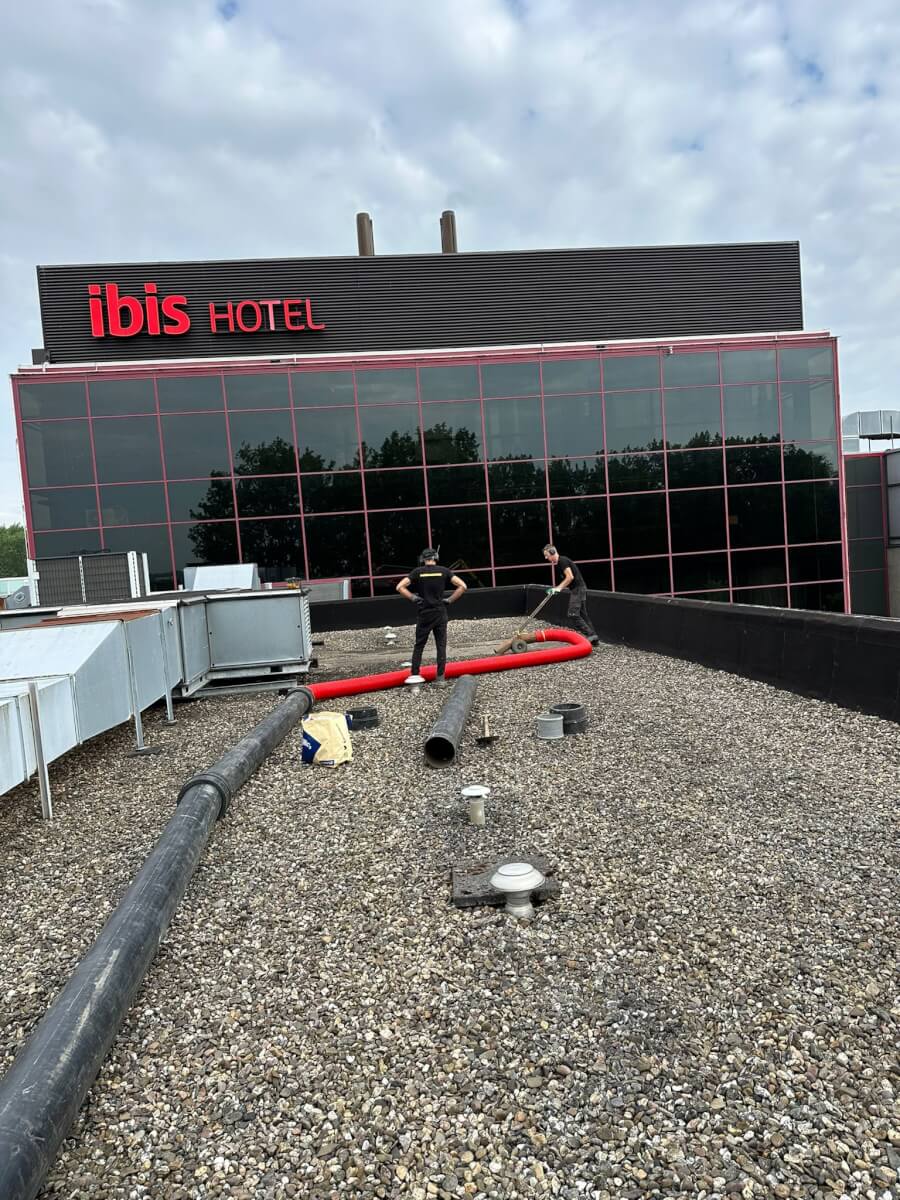 Dakgrind verwijderen en afvoeren kan een tijdrovende klus zijn, tenzij je zuigtechniek inzet. Met een zuigwagen wordt dakgrind snel, stofvrij en volledig gecontroleerd weggezogen. Voor Dakdekkersbedrijf Edec B.V. hebben wij op het dak van het Ibis Hotel in Badhoevedorp ruim 750 m² dakgrind zorgvuldig verwijderd en afgevoerd. Dankzij het gebruik van onze krachtige zuigwagens kon het werk efficiënt worden uitgevoerd zonder hinder voor hotelgasten of schade aan de dakbedekking.
